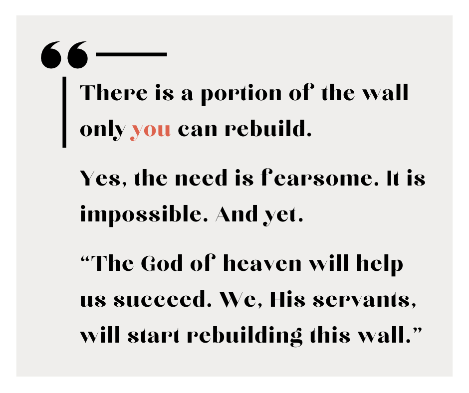 “You know very well what trouble we are in. Jerusalem lies in ruins, and its gates have been destroyed by fire. Let us rebuild the wall of Jerusalem and end this disgrace!...The God of heaven will help us succeed. We, his servants, will start rebuilding this wall.” Nehemiah 2:20