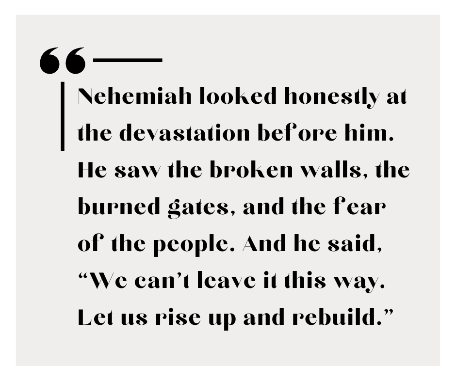 Nehemiah looked honestly at the devastation before him. He saw the broken walls, the burned gates, and the fear of the people. And he said, “We can’t leave it this way. Let us rise up and rebuild.” And the people responded. Not because they were strong, but because they trusted that “the God of heaven will help us succeed.”